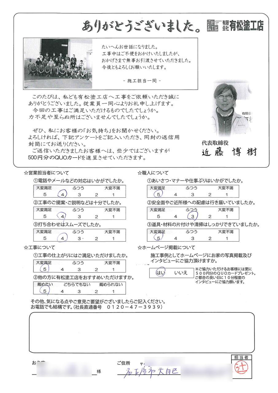天白区N様邸の外壁塗装と防水工事 2025/10/03 竣工2024/11/28完工2024/12/21施工内容外壁塗装・防水工事塗料外壁塗装 SK プレミアム無機 173.4㎡総額109万円 施工前と施工後 お客様の声 弊社より ご返信 調査内容 戸建 外壁塗装 名古屋市 天白区